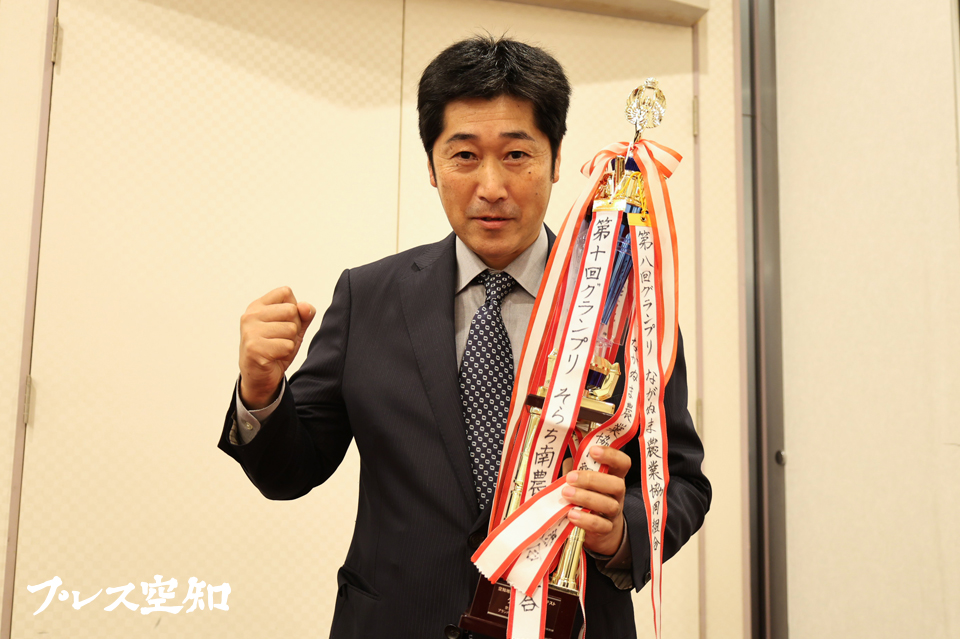 【岩見沢】道産ブランド米ゆめぴりかのおいしさを競う「第10回空知地区ゆめぴりかコンテスト」が5日、ホテルサンプラザで開かれた。空知管内10農協が参加した食味審査の結果、そらち南農協(本所・栗山町)が2回目のグランプリに選ばれた。また、準グランプリに昨年のグランプリだったピンネ農協と美唄市農協が選ばれた。(写真=トロフィーを手にするJAそらち南「ゆめぴりか」生産組合の賀集組合長)