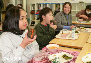 「赤黒ホットドッグ」が給食に登場 赤平のまちづくりにちなんだメニュー