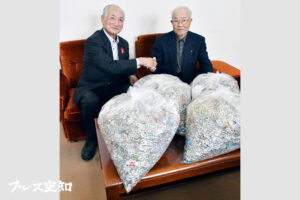 91歳の宝利さん、プルタブ32キロを岩見沢社協へ最後の寄贈