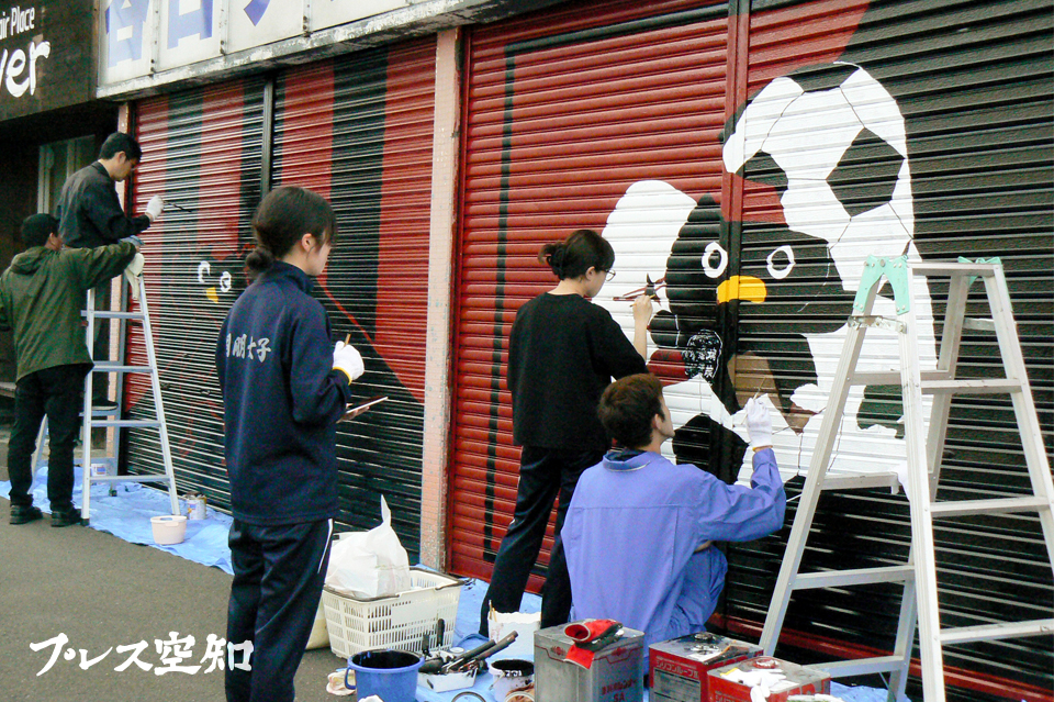 空き店舗のシャッターに「赤黒」に 火文字やちぷ太を描いて赤平をPR