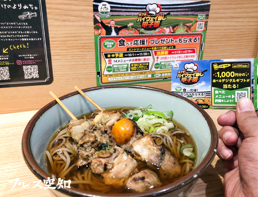 ネクスコ東日本とネクセリア東日本は、高速道路のサービスエリア(SA)などで提供しているメニューのナンバーワンを決める「第2回ネクスコ東日本ハイウェイめし甲子園」を開催している。道・県で行う予選は11月30日までで、道内からは砂川・岩見沢の上下線SAの4店を含む計8店7品がエントリー。ナンバーワンは来年4月に発表される。(写真=道央道岩見沢SA(上下線)のメニュー「とりもつ串そば」)