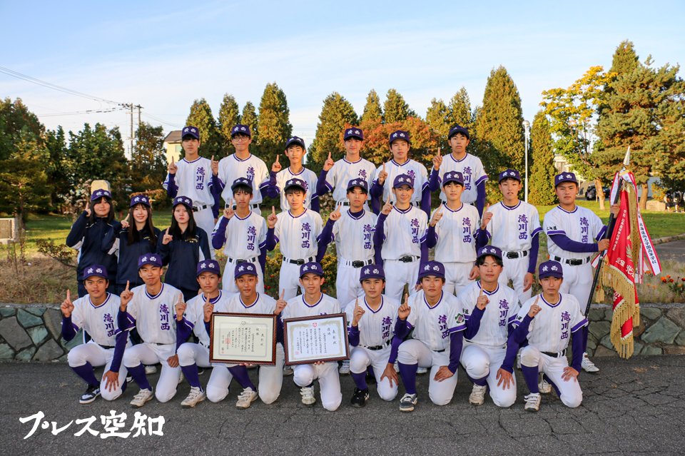 【滝川】滝川西高軟式野球部(堂前大翔主将)が5日、釧路市で開かれた2025年の秋季北海道高等学校軟式野球大会の決勝戦で登別明日(あけび)高に勝利し、7年ぶりに優勝した。堂前主将は「率直にうれしい。来年の夏へ向けての課題も見つかったので、夏の優勝を目指し、課題を解消していきたい」と話し、念願の全国大会出場へ照準をあわせている。(写真=7年ぶりに全道大会で優勝した滝川西高軟式野球部)