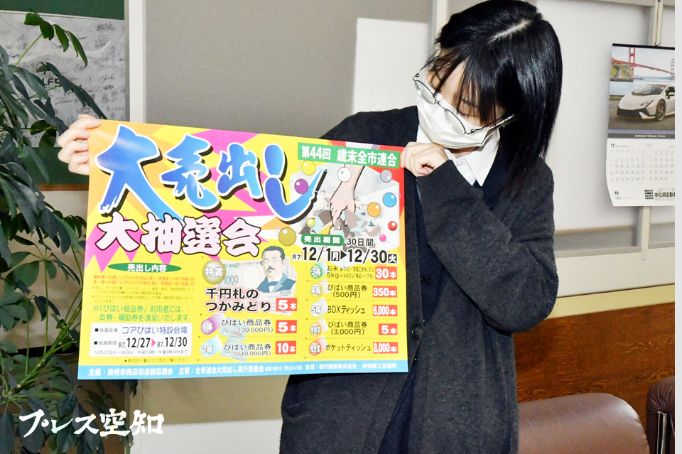 【美唄】市内29店舗が参加する「第44回全市連合大売出し」(市商店街連絡協議会主催、実行委主管)が12月1日、各店舗で始まる。30日までの歳末恒例イベントで、「千円札のつかみどり」などが当たる抽選券は、買い物等で5千円ごとに進呈。抽選は、コアビバイ特設会場で12月27~30日に行われる。(写真=全市連合大売り出しのポスター)