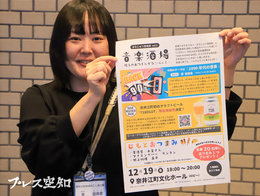 【奈井江】ないえ共奏ネットワークは19日午後6時から8時まで、「まちじゅう音楽部vol.6 音楽酒場~地元のおつまみでカンパイ!~」を町文化ホールロビーで開催する。今回は町の賑わいの創出を目指す「NAIE NIGIWAI BASE」との共催で、9月のイベントでお披露目後即日完売となった町初のクラフトビール「718OLUTO」が限定再販される。ホストを務める地域おこし協力隊の東留美香さんは、「忘年会のようにゆるく楽しめるイベント。一人でも友だちともふらっと遊びに来てください」と呼びかけている。入場無料。(写真=来場を呼びかける東さん)