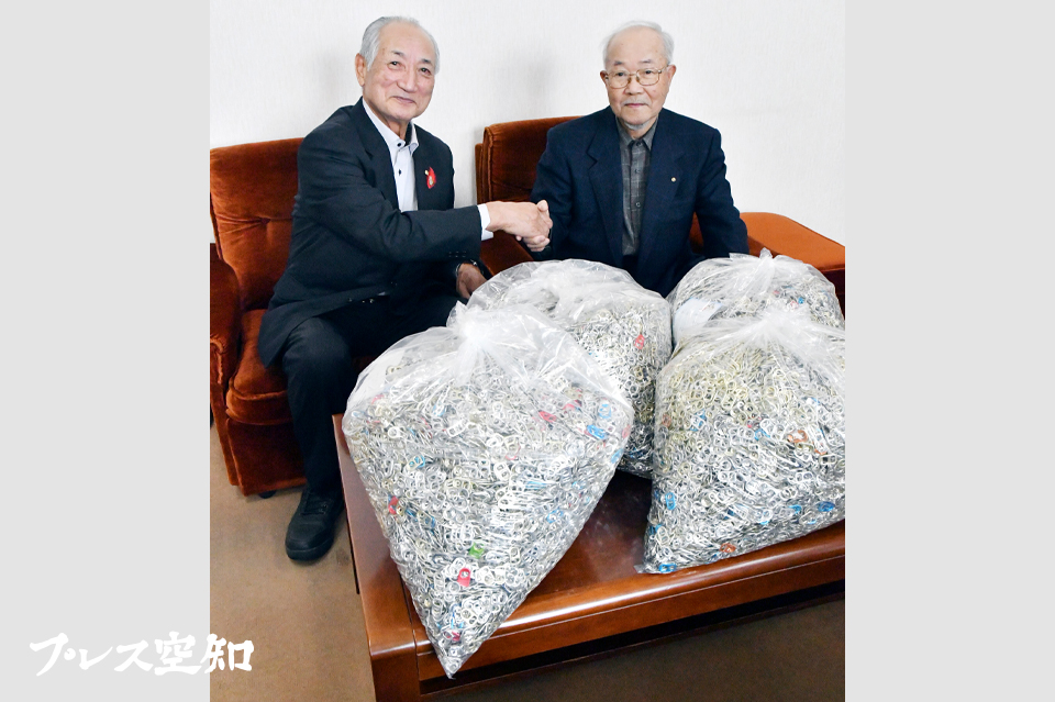 【岩見沢】市内在住の宝利芳一さん(91)が9日、市社会福祉協議会を訪ね、地域のリサイクルステーションなどの空き缶から1年間かけて回収したプルタブ32㌔を届けた。回収は2012年から始め、1年分を毎年この時期に届けている。今年で14回目となったプルタブ寄贈は累積で598㌔になった。(写真=集めたプルタブを寄贈する宝利さん(右))