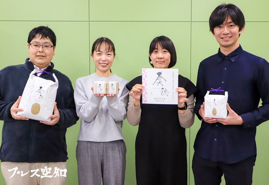 【奈井江】ないえ共奏ネットワークはこのほど、奈井江町をPRする特栽米「奏穂(かなでほ)」の取り扱いを開始した。担当者は「奈井江町のおコメのおいしさを広め、手間をかけて大事に育ててくれた農家さんの思いを感じてもらえたら」と話している。(写真=「奏穂」を手にないえ共奏ネットワークのメンバー)