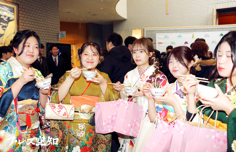 【奈井江】町の二十歳を祝う会が11日、文化ホールで開かれ、式典やミニコンサートで出席者を祝った。会場では奈井江初のクラフトビール「718」を開発するなど新たな町のにぎわい創出を目指す官民連携団体「NAIE NIGIWAI BASE」が、町の特産品を組み合わせた「サツマイモ炊き込みご飯」をふるまい、晴れ着姿の出席者が味わった。(写真=サツマイモご飯に笑顔を見せる晴れ着姿の参加者)