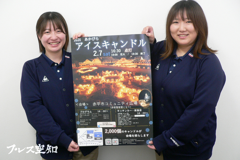 【赤平】北海道光生舎主催の「あかびらアイスキャンドル」のイベントが2月7日午後4時から、赤歌警察署隣の市コミュニティ広場で開催する。会場にはキッチンカーや飲食店も登場し、総合体育館横のふれあいホールではミニライブが開かれ、幻想的な雰囲気を堪能しながら食事やミニライブが楽しめる。(写真=ポスターを手に来場を呼びかけるスタッフ)