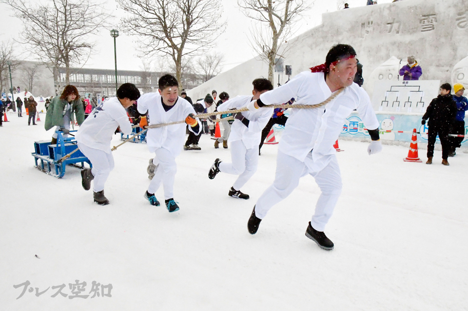 【岩見沢】冬を楽しむ「第36回IWAMIZAWAドカ雪まつり」が7、8の両日、駅東市民広場公園と隣接のイベントホール赤れんがで開かれた。会場には、メインステージの雪像に併設された巨大すべり台を大人も子どもも歓声を上げて楽しんだほか、5人で50㍍引く速さを競う「人間ばんば選手権」や小学生限定の「ちびっこ人間ばんば」の出場チームには大きな声援が送られた。(写真=会場から大きな声援が飛んだ人間ばんば選手権)