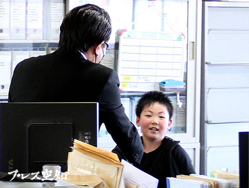 【美唄】美唄市役所の庁舎を丸ごと使った「市役所かくれんぼ」が14日に行われ、小中学生約40人が議場や教育委員会事務局などに隠れて楽しんだ。(写真=4階にある市教委の事務所でオニ役の桜井市長(左)に見つかり苦笑いの男の子)