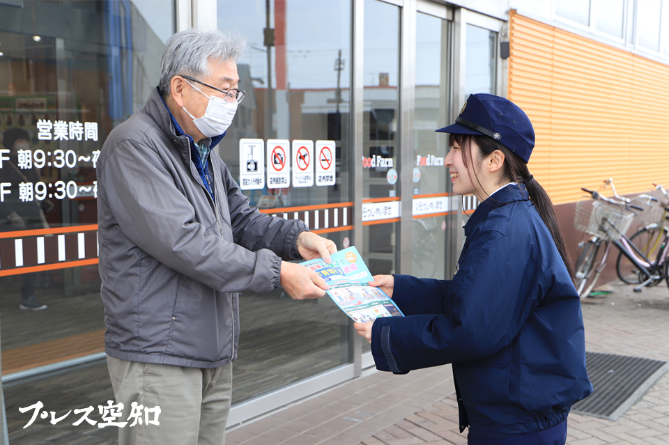 例年よりも雪解けが早まる中、道路を走る自転車の姿も増えている。手軽な交通手段として重宝される自転車だが、今年4月から「青切符」と称される交通反則通告制度が適用される。制度導入を控え、滝川警察署は19日、砂川市内のフードファーム新すながわ店前で啓発を実施した。滝川署は「違反時の手続きを簡略化する仕組みの導入であり、取締りを厳格化するわけではありません」と理解を求める一方、「重大な事故に繋がるスマホのながら運転や飲酒運転などは絶対にしないで」と呼びかけている。(写真=自転車の安全運転を呼びかける滝川署員(右))