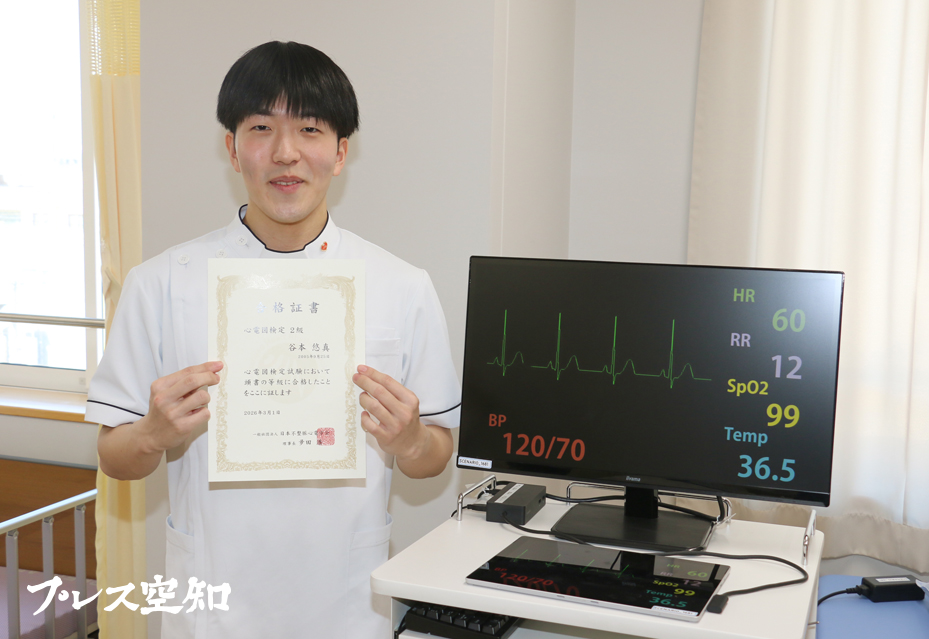 【滝川】市立高等看護学院2年で滝川市在住の谷本悠真さん(20)がこのほど、日本不整脈心電学会が実施する心電図検定2級に合格した。同学院では初の快挙で、谷本さんは「こんなに勉強に時間をかけたのは初めてだったので合格できてうれしい。自分をほめてあげたい」と笑い、「この経験を生かして次は国家試験に全力を尽くしたい」と意欲をみせる。(写真=心電図検定2級に合格した谷本さん)