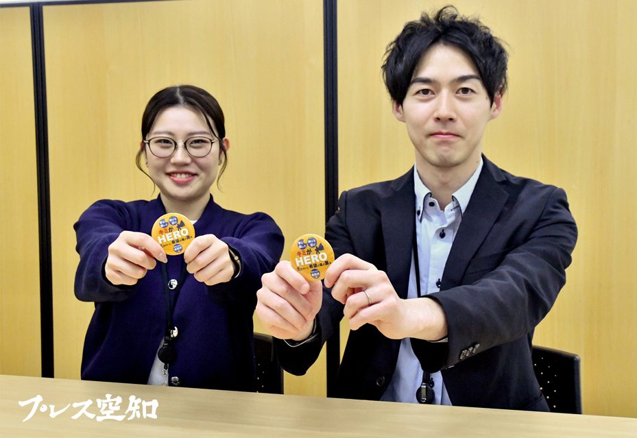 【岩見沢】市教育委員会は、新年度からの学校教育改革ビジョンに掲げた思いを込めたキャッチコピー「キミがHERO」のロゴマークを作成した。市教委では市内各校に提供したほか、事務局職員用に作ったバッジを配り、アピールをしている。(写真=バッジを手に事務局職員)