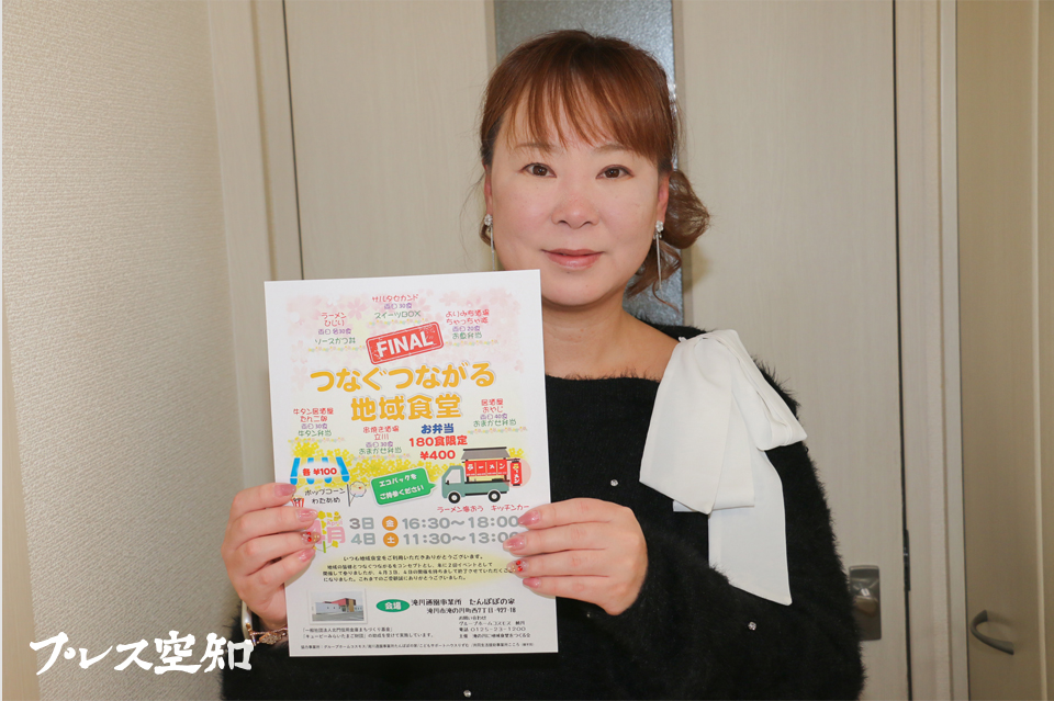 【滝川】滝の川地域で地域食堂に取り組む「滝の川に地域食堂をつくる会」(本郷一美会長)は3日と4日、春休みのつなぐつながる地域食堂を滝川通園事業所たんぽぽの家=市内滝の川西7=で実施する。2018年8月から始まった活動は今回が最後に。本郷会長は「みなさんの協力もいただき、感謝しかありません」と話し、多くの来場を呼びかけている。最後の食堂は、3日午後4時半~6時、4日午前11時半~午後1時に実施する。(写真=地域食堂の来場を呼びかける本郷会長)