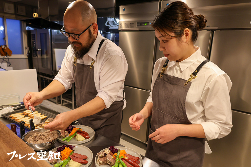 【美唄】今月10日にJR美唄駅近くにオープンするビストロフレンチ「Bistro Montagne(ビストロ・モンターニュ)」=市内東1南3=で3月30日、関係者を招いたオープニングレセプションが開かれた。桜井恒市長をはじめ22人が参加し、市内で獲ったエゾシカやウド、ニジマスなどの食材を使った本格フレンチと、料理に合うワインやノンアルコールを提供した。(写真=オープニングレセプションで料理を準備する山本さん(左)と市川さん)