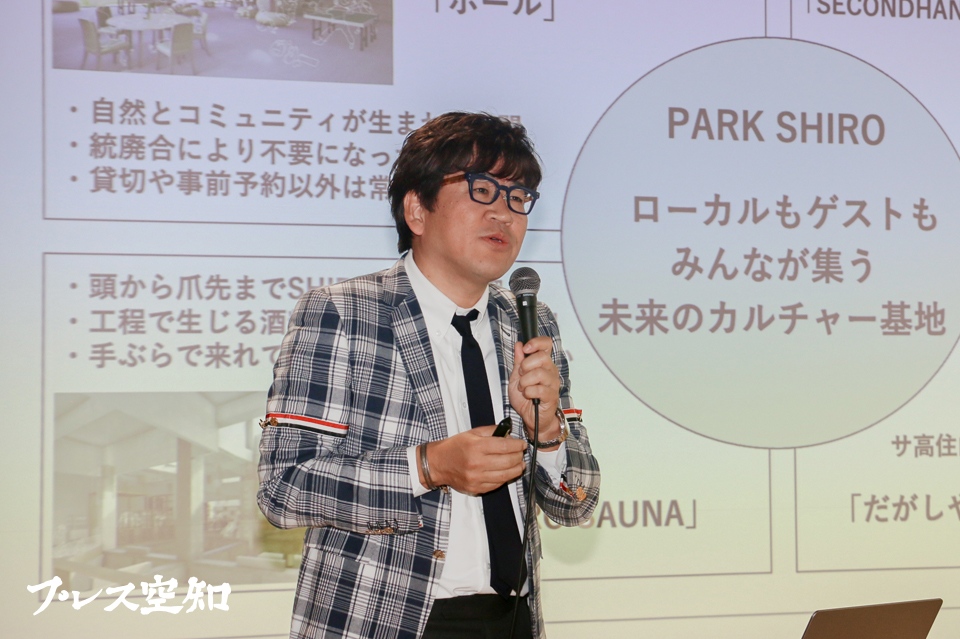 【砂川】化粧品製造などのシロ(福永敬弘社長)は10日、改修工事に取り組む砂川パークホテルに関する説明会をみんなの工場で開き、新しい名称を「PARK SHIRO」と公表した。宿泊施設「みんなのホテル」とサービス付き高齢者向け住宅「みんなのおうち」で構成し、福永社長は「地元の方々と観光客も集う未来のカルチャー基地にしたい」との構想を披露した。オープンは来年1月19日を予定している。(写真=新施設の概要を説明する福永社長)