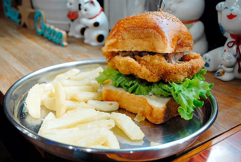 ボリューム満点のメニューが人気のバーガー&カフェ「スラッピーキャット」(神山雅行さん)のおススメは通常メニューの2倍サイズで土日祝日のみ1日1個限定の「ビッグソウルチキンバーガー」(2400円)。
